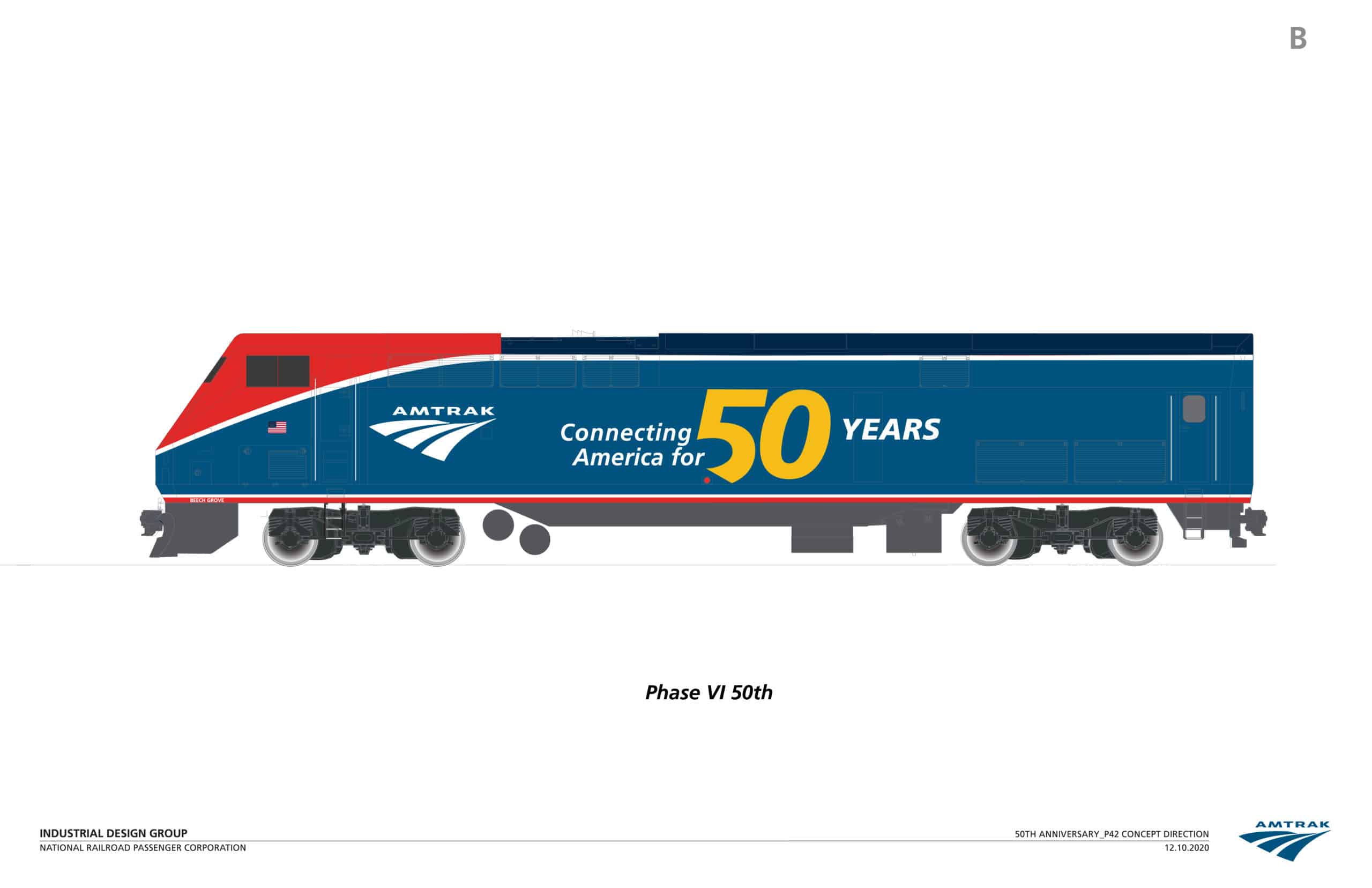 P42 # 46 en “Phase V 50th” – La librea estándar de Amtrak durante las últimas dos décadas con nuestro eslogan “Conectando América durante 50 años” que incluye un gran 50 amarillo dorado.