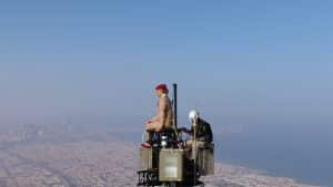 A casting call was put out to Emirates’ very own cabin crew and while there were some willing and capable candidates, a professional skydiving instructor was cast to ensure the highest levels of safety. Unseen on camera, Nicole was secured to a pole built on top of the spire by a harness under the Emirates uniform.
