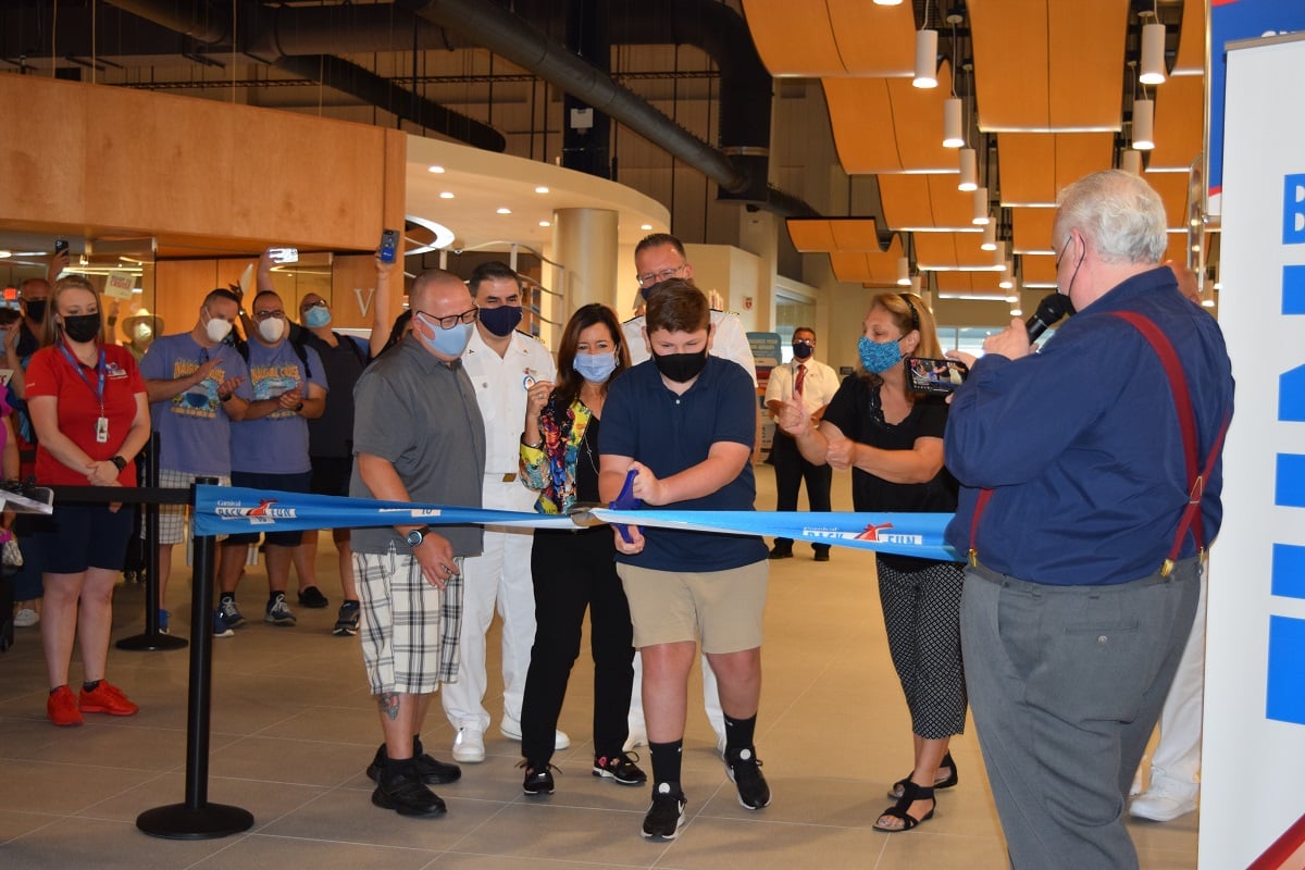 To celebrate Carnival Cruise Line’s maiden voyage of its newest and most innovative ship, Mardi Gras, Carnival President Christine Duffy and Mardi Gras Captain Giuseppe Giusa led a “Back to Fun” ribbon-cutting ceremony officially welcoming guests on board.