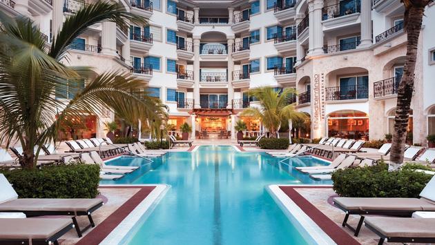 The Playa Hotels & Resorts property is designed with Italian-style architecture, with a white exterior, stylized Roman columns and decorated iron railings.