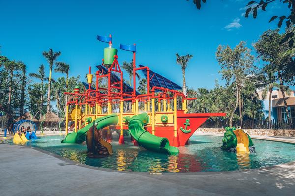 The new waterpark features a swimming pool with a pirate ship and an artificial beach area for games.