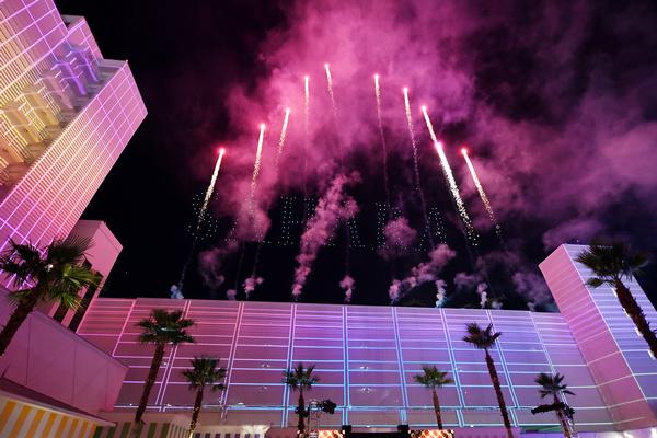 The unveiling involved a Las Vegas first: 250 Intel Shooting Star drones—capable of creating more than four billion color combinations to light up the sky—as well as 3D projection mapping were used to create an aerial light show spectacular. Dynamic visual projections included spinning slot reels, winning black jack hands, and other imagery paying homage to Las Vegas’ glamorous past. The show’s lead-in consisted of choreographed dance led by a troupe of authentic Las Vegas showgirls and dancers. Its grand finale featured Intel Shooting Star drones, which revealed the new SAHARA name and logo via a dazzling pyrotechnics display.